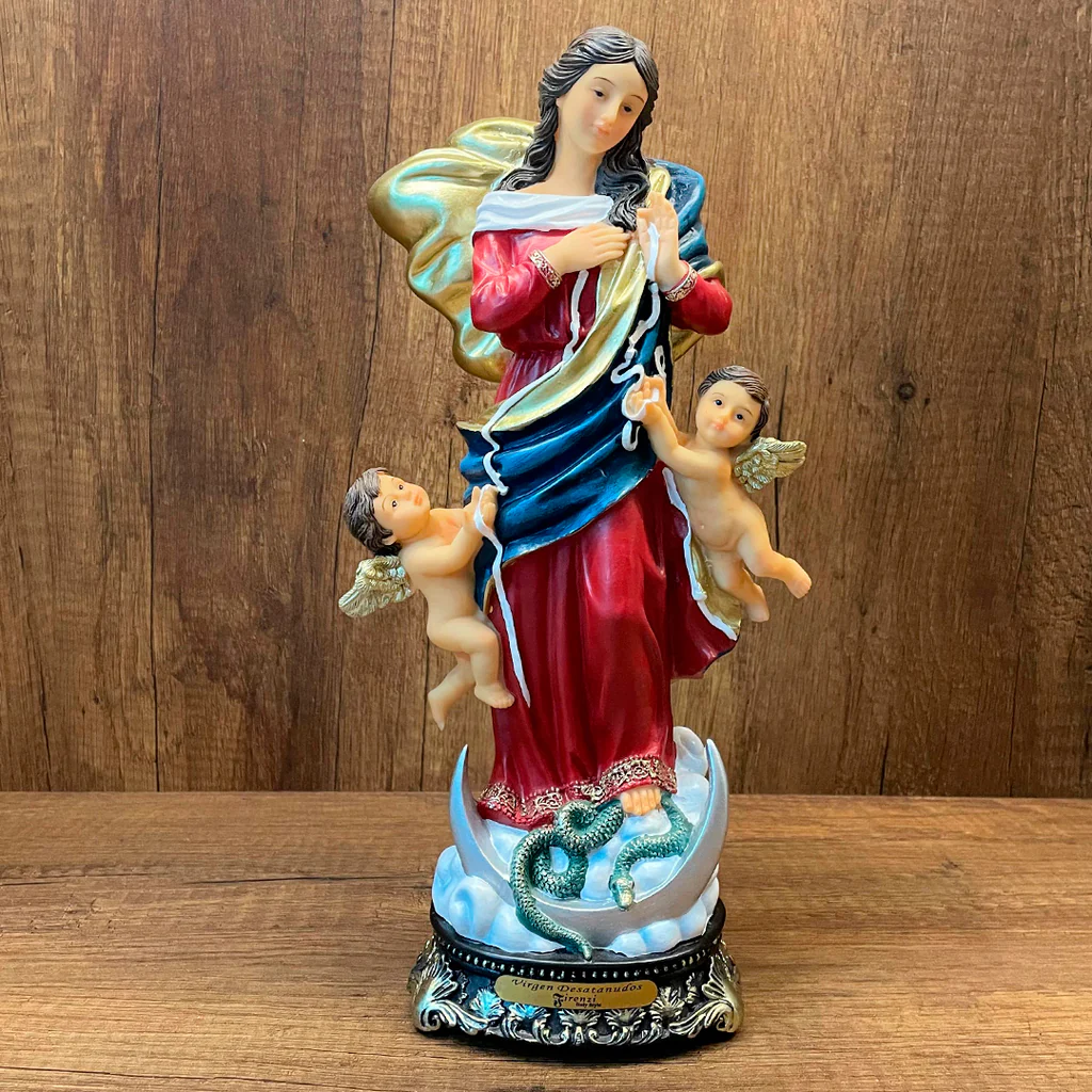 Representada en cuadros, imágenes de yeso o cerámica, su imagen muestra a María desatando nudos de una cinta, simbolizando su cuidado amoroso por cada persona. Esta advocación invita a confiar en su maternal protección y a acudir a ella con fe y sencillez, especialmente en momentos de angustia y desesperanza.
